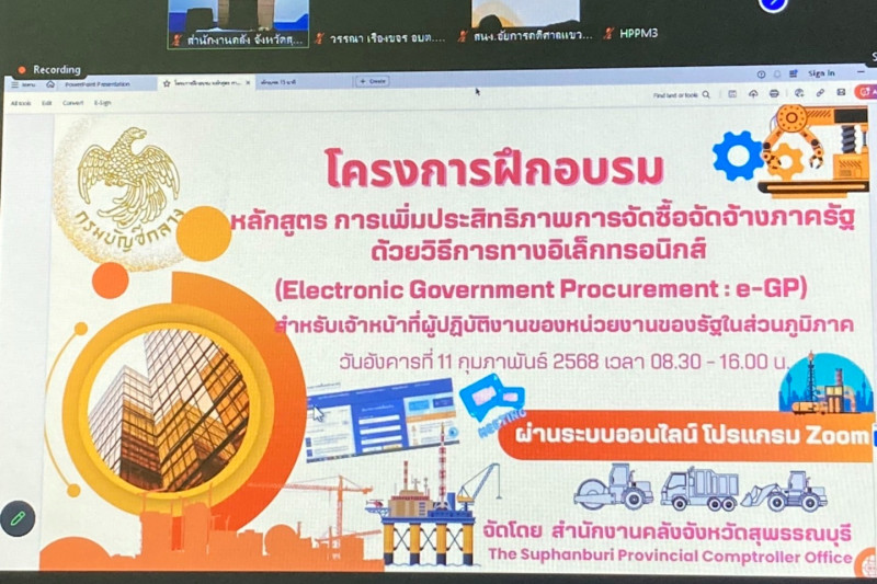 วันที่ 10 - 11 กุมภาพันธ์ 2568 นายมนตรี เทพโพธา สหกรณ์จังหวัดสุพรรณบุรี มอบหมายให้นายจารุวัฒน์ ทวีเขตร์กิจ หัวหน้าฝ่ายบริหารทั่วไป พร้อมด้วยนางสาวพัชรัตน์ รัตนาละออ นักวิชาการสหกรณ์ปฏิบัติการ เข้าร่วมโครงการฝึกอบรมด้านการจัดซื้อจัดจ้างภาครัฐ สำหรับเจ้าหน้าที่ผู้ปฏิบัติงานของหน่วยงานของรัฐในส่วนภูมิภาค ผ่านระบบออนไลน์ Zoom Meeting เพื่อให้เจ้าหน้าที่ผู้ปฏิบัติงานหรือผู้ที่เกี่ยวข้องด้านการจัดซื้อจัดจ้างและการบริหารพัสดุของหน่วยงานมีความรู้ความเข้าใจเกี่ยวกับระเบียบกระทรวงการคลังว่าด่วยการจัดซื้อจัดจ้างและการบริหารพัสดุภาครัฐ พ.ศ. 2560 และสามารถจัดซื้อจัดจ้างผ่านทางระบบการจัดซื้อจัดจ้างภาครัฐด้วยอิเล็กทรอนิกส์ (e-GP) ได้อย่างถูกต้อง และมีประสิทธิภาพ ณ ห้องประชุม สหกรณ์ สำนักงานสหกรณ์จังหวัดสุพรรณบุรี อำเภอเมืองสุพรรณบุรี จังหวัดสุพรรณบุรี