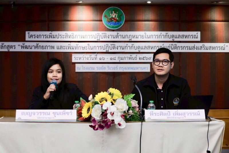 วันที่ 18 กุมภาพันธ์ 2569 นางสาวอภิชญา ใจดี นิติกรปฏิบัติการ และนางสาวประมวล ทองผดุง นิติกร เข้าร่วมอบรมโครงการเพิ่มประสิทธิภาพการปฏิบัติงานด้านกฎหมายในการกำกับดูแลสหกรณ์ “หลักสูตรพัฒนาศักยภาพ และเพิ่มทักษะในการปฏิบัติงานกำกับดูแลสหกรณ์แก่นิติกรกรมส่งเสริมสหกรณ์” ระหว่างวันที่ 16 - 18 กุมภาพันธ์ 2569 โดยมีนายประวัติ แดงบรรจง รองอธิบดีกรมส่งเสริมสหกรณ์ เป็นประธานในพิธีเปิดโครงการ ณ โรงแรมรอยัล ริเวอร์ เขตบางพลัด กรุงเทพมหานคร สำหรับการอบรมในครั้งนี้ มีวัตถุประสงค์เพื่อเสริมสร้างทักษะและแลกเปลี่ยนเรียนรู้ในการปฏิบัติงานกำกับดูแลสหกรณ์